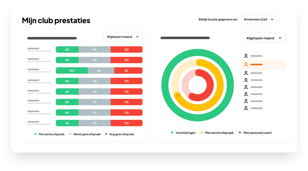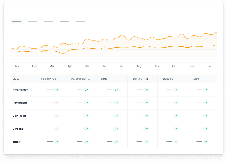 Voorkom ontevreden leden en prestatiegaten door sneller te schakelen op basis van realtime inzichten in knelpunten. Verzamel alle KPI’s en data op één dashboard, ontdek bottlenecks en stuur met één klik bij. Vergroot omzet, loyaliteit en rust met data als stuur.