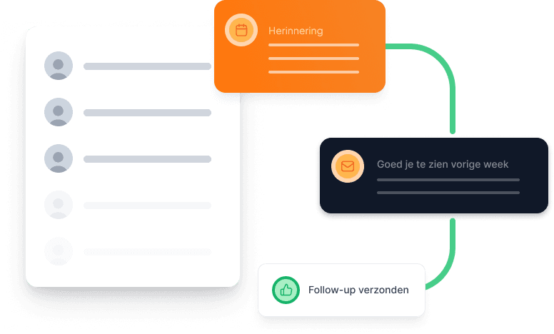 Bepaal welke actie jij op welk moment wilt en door wie. Of het nu een taak is met een belactie, een bericht met een afspraaklink of het delen van een nieuw trainingsschema. Leg jouw manier van werken vast, zodat elk lid automatisch en consistent op een persoonlijke manier de gewenste service krijgt.